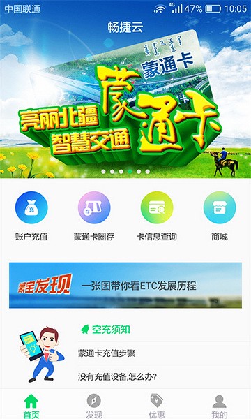 畅捷云平台是一款专门为内蒙古地区的用户们而打造的高速公路etc缴费服务软件,众所周知ETC的使用给广大的车友们提供了非常便捷的出行服务,通过该平台,用户可以轻松地进行各种业务操作,如查询蒙通卡信息、账户充值、线上圈存充值等。不仅可以方便地管理自己的银行卡信息,还可以实时获取业务办理进展情况,为用户的生活带来极大的便利。
