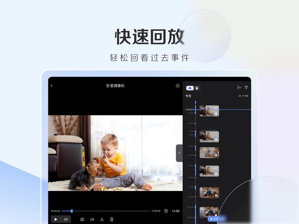 【远程查看,轻松分享】 随时随地查看实时视频、历史录像,进行语音对话、视频留言等互动,您也可以与家人分享您的视频,让他们也能轻松观看~