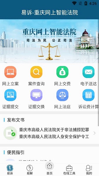 这款重庆易法院app由重庆市高级人民法院推出,功能很全面,涵盖了网上立案、纠纷调解、案例查询等服务,特别适合外地用户,不用跑法院就能搞定很多事。