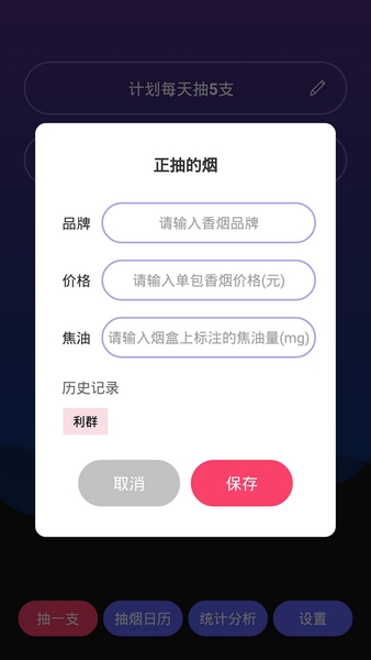 费用与焦油计算:只需输入您的香烟品牌、香烟价格与焦油量,即可帮您分析您抽烟一共花了多少钱,摄入了多少焦油。如果您习惯抽不同的香烟,无需每次输入,只需在历史记录里选择本次抽烟的品牌即可。