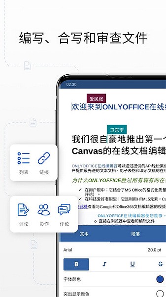 在使用onlyoffice安卓版时,您可以方便地上传和下载文件,创建文件夹,并通过WebDAV登录云端,实现对云存储的便捷访问。应用不仅支持多人同时编辑同一文档,还能授予不同类型的访问权限,确保协作更加灵活高效。编辑器提供了移动视图和所见即所得的编辑模式,使得在手机上编辑文档更加方便。综合而言,onlyoffice安卓版是一款功能强大、适应性强、办公效率提升的不可或缺的办公软件。