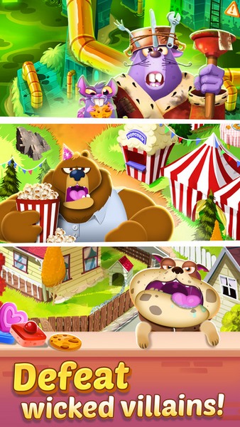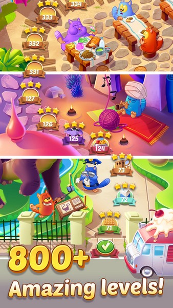 游戏的画面也很漂亮,颜色很丰富,看起来就很舒服。里面的猫咪都很可爱,特别是它们的能力还能升级,甚至能用星星解锁特殊关卡,感觉像养宠物一样有趣。玩法也很简单,就是把相同颜色的饼干连在一起消除,三个就能炸了,但如果遇到小动物偷吃饼干,就得合成炸弹把它们轰走。