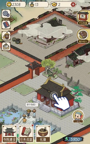 2.开启化缘:下山化缘,便有机会获得丰富的道具和相关事件,从而更好的建设寺庙。