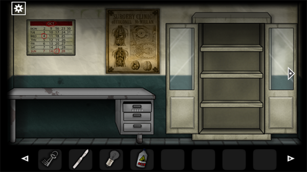 1、醒来后出门到第四个房间(医务室),观察墙上的日历(OCT是十月英文的缩写)获得密码「10421」,接着输入密码打开下面的抽屉获得「一串钥匙」。