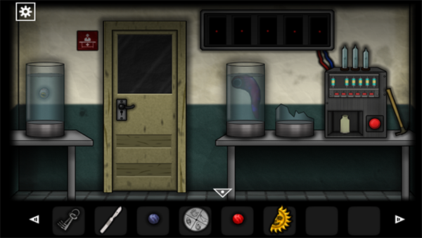 20、将药水瓶放在右边的机器上,根据纸条上的提示移动药水瓶,完成后获得「血清」。接着用锤子打破左边的罐子获得「眼睛」,再观察上面出现的符号,然后到外面走廊。