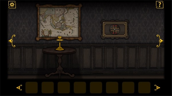 2、往里深入,看到墙上的地图和小圆几上的蜡烛台。旁边墙上有个谜题。继续往里,进入左边门中,梳妆台的镜子上夹着一张纸片,上面写着:光明总能揭露真相。用钥匙打开梳妆台的柜门,按下右面红色按钮,会发现变换的字母和与之相对应的图形。屋中右边的柜子上似乎缺少了什么。