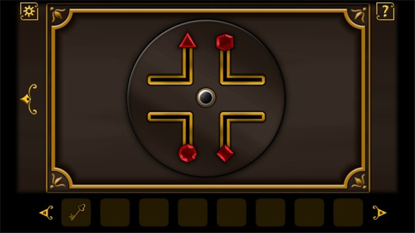 5、来到走廊地图旁的谜题前,上面正是fate所代表的几个图形。利用纸条的提示,可以解开这个谜题。点击中央圆钮旋转圆盘,把每个图形放置到正确的位置便可以了。得到钥匙。