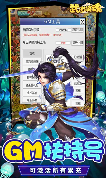 武道将魂BT版是一款节奏感非常强烈的回合制挂机手游,带给玩家前所未有的冒险体验。游戏节奏极速,爆率超高,让你畅快体验冒险之旅。首次上线即可获得GM工具,免费激活首充等多种高回报活动。此外,全圣兽礼包等你免费解锁!你还可以将普通泡泡卡直接魔改成超圣兽变异泡泡!武道将魂游戏中各种活动福利免费领取,更有10E元宝等你升级!开局即享VIP50特权,丰富的召唤兽、神兽、伙伴和坐骑等你来驾驭。轻松培养战力,让你的战力轻松突破千万!