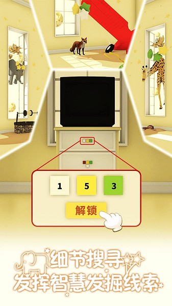 1、首先要找到油漆桶, 转到树的房间,点墙边的机关,密码见画板↑→↓↗,点大象拿油漆