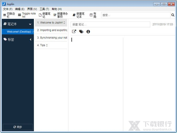 Joplin(桌面云笔记软件)是一款可以在桌面上运行的云笔记软件,用户可以直接在桌面中直接记录自己的笔记,可以将文字输入进去然后对笔记进行标记和修改,最大的优点在于能够处理量的笔记组织成为自己的笔记,还支持对笔记进行搜索。,话可以支持Markdown格式。可以直接从电脑应用或者程序将自己的文本编辑器中复制、标记、修改等功能,并且还支持文件附件,还可以支持到多种语言,可以对排序处理有着非常的方便,有兴趣的用户赶快来下载试试吧!