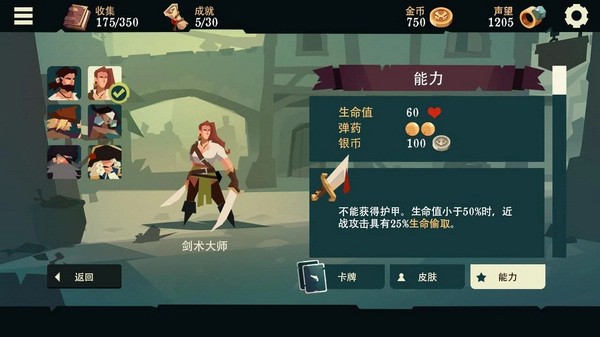 角色特性:可以切换风格,战斗开始时随机获得一种风格,“进攻”提高1点攻击,“伪装”获得25%生命偷取,“演奏”回合结束后装填手牌数量的弹药