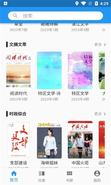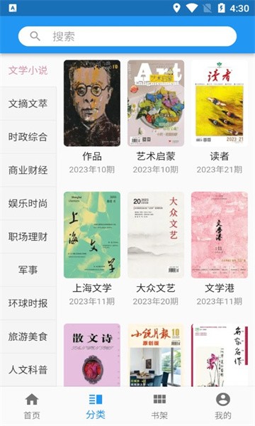 2、用户可以在分类中查找自己想要寻找的不同类型刊物,里面包括文学小说、文摘文萃、时政综合、商业财经、人文科普、家庭养生、农业农村等等类型,涉及的领域非常丰富。