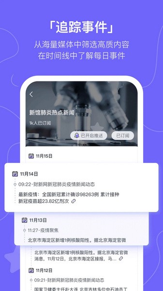 5、跟踪查看感兴趣的热点事件,有后续报道的时候,方便用户在线查看信息。