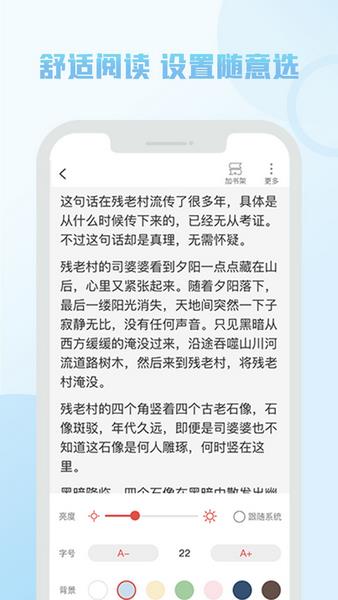 背景颜色、字体、字号任你挑;自定义排版、书签功能、夜间模式等特色功能让你畅享阅读趣味!