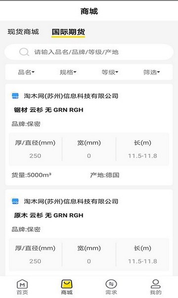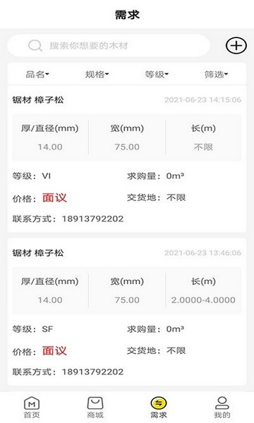 用户可以按照品名/品牌/等级/城市查找相关木材,并进行选择
