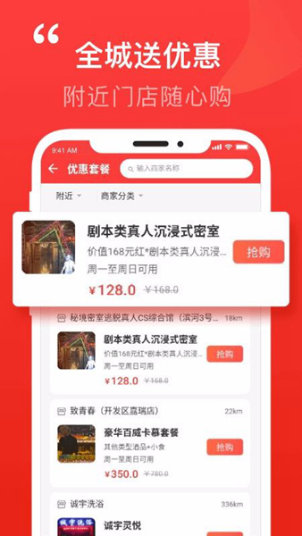 1、提供美食购物、休闲娱乐、商超便利、二手交易等功能