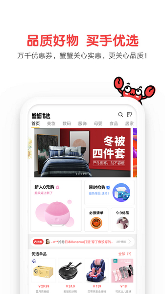 蟹蟹优选app是一款超好用的省钱网购软件,内置海量超多折扣商品,致力于让大家不花一份冤枉钱!平台均为人工选品,性价比高不说,还每天10点准时上新,便宜到让你尖叫!这里还有超多9块9包邮的特价精品,让你随心所欲、想买就买!软件还会每天为大家精选上万张购物优惠券,下单还有返利领!让你边花钱还能边赚钱!作为一款使用十分方便的手机购物软件,蟹蟹优选旨在为大家淘到更多更优质的实惠商品,让大家拥有良好的购物体验!