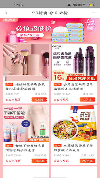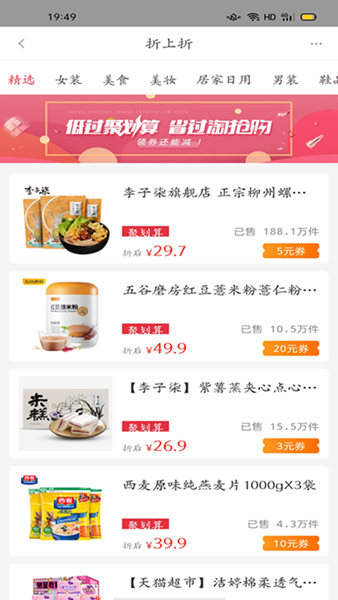 多样化的专业折扣模式,九块九包邮、品牌优选、折上折、聚划算、生活劵等;