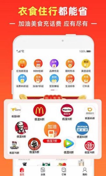 覆盖衣食住行,吃喝玩乐各种生活服务,9.5折充话费,8折订外卖,美食饮品低至5折,加油9折起,9.6折打车,线下商超低至5.6折 ;