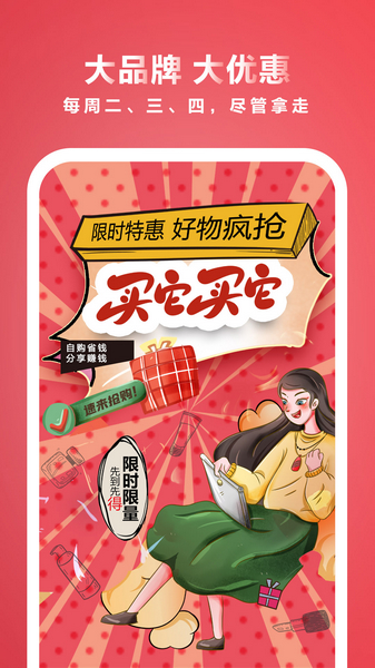 自主精品:APP销售类目包括美肌护肤、时尚美妆、口腔护理、个人洗护、居家用品等多品类自主研发的优选精品。
