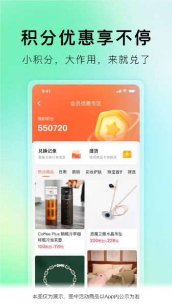3、积分优惠:用户可以使用积分兑换需要的优惠好物,轻松进行商品兑换。