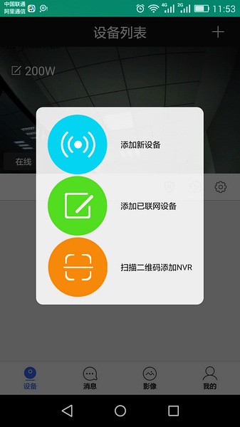 2、打开手机软件登陆后,设备列表往下拉刷新,发现新设备之后,点击“新设备”添加,选择一种你想要的连接方式;