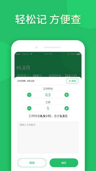 1.操作简单方便, 无需注册登录,便可记录加班小时。