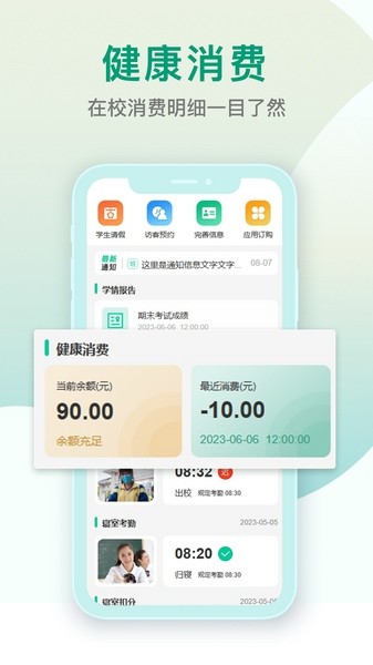 为家长提供学生在校一卡通消费信息,包括充值、消费、金额、地点、时间等!