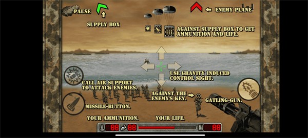 4、多种武器,加特林机枪、火箭弹、空袭指令等多种武器,犹如真实战争般震撼。