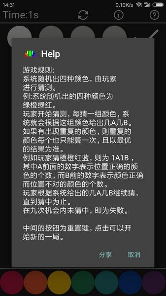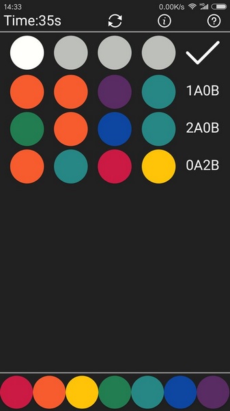 珠玑妙算是一款非常不错的密码破译棋盘游戏,有着全新的推理玩法,玩家需要通过不断的尝试来猜出系统所设置的颜色密码。游戏玩法简单,大家可以在这里享受全新的推理和解谜乐趣。珠玑妙算有着简约的画面风格,大家需要不断尝试并猜测系统所设置的四位数的颜色密码,玩家们只有9次机会,需要从下方所给出的7种颜色着逐一排除,非常考验大家的推理能力。