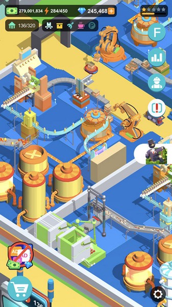 1、下载进入超级制造工厂,玩家通过升级每个车间的机器,可以提升生产的速度;