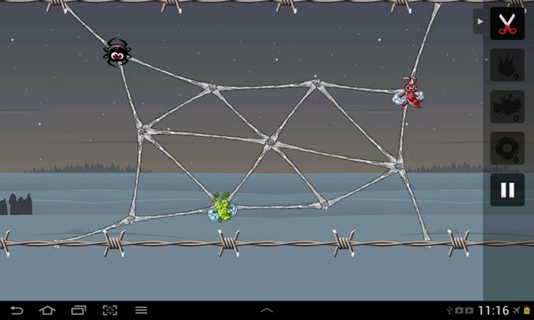 这是一个很考验大脑的游戏,你需要的是有目的的弄断蜘蛛网,不能漫无目的去弄,不然就浪费了一次行动机会。在这里教大家一个窍门,把自己想象成这只贪婪的蜘蛛,然后揣摩出蜘蛛的下一步动作,然后实施协助,只要蜘蛛没有了吃到小蝴蝶的路线,那这关就过了。