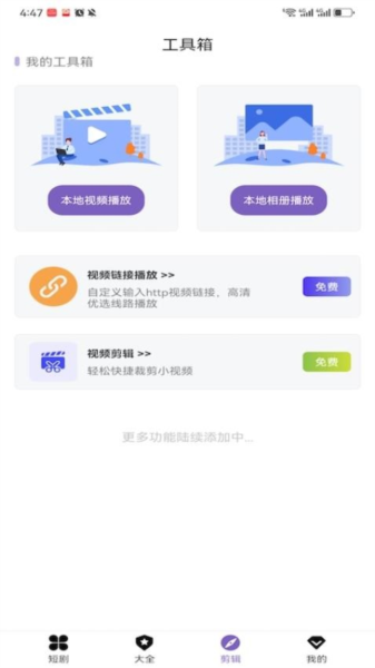 除了追剧,河马短剧还有很多实用的小工具,比如本地视频播放、链接播放和视频剪辑功能。这些功能特别适合喜欢自己动手制作视频的小伙伴,简单又方便。