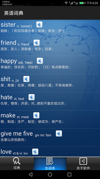 英语词典是一款非常不错的英语词典软件。用户通过这个软件能够快速查询不认识的英语单词,了解单词的意思、用法、读写和相关短句的运用,让用户能够更加快速的了解和掌握生单词,同时提供生词本的功能,帮助用户认识更多的单词。
