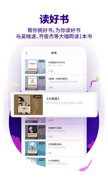 《大败局》《穷爸爸富爸爸》……涵盖商业、经济、人文等经典好书,吴晓波等大咖亲自解读,上班路上听、开车听、睡前听,把有声商业图书馆随时带在身边。