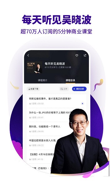 吴晓波频道app是一款非常实用的课程学习应用,软件是由吴晓波团队打造,为用户们提供了财富、职场、家庭、见识四个方向,大家可以跟随着吴晓波一起学习非常多的课程,学习企业家们的商业思维,大家一起跟随着时代趋势,发掘当下投资机会。此外软件内还有许多专业的教授、业内专家和媒体人来教授课程,用户能够深度了解企业经营模式,帮助大家可以快速从入门到高阶,有需要的用户可以尝试一下哦。通过吴晓波频道app,用户不仅能听吴晓波讲商业日课,还可跟随媒体人等授课老师发掘当下投资机会,构建财富地图,各种系列课程贯穿软件,助力用户家庭财富增长和职场晋升。软件内汇聚超85万人订阅的商业日课,每天5分钟,让用户快速从入门到高阶,见识商业变革、禅宗智慧等多方向系列课程。