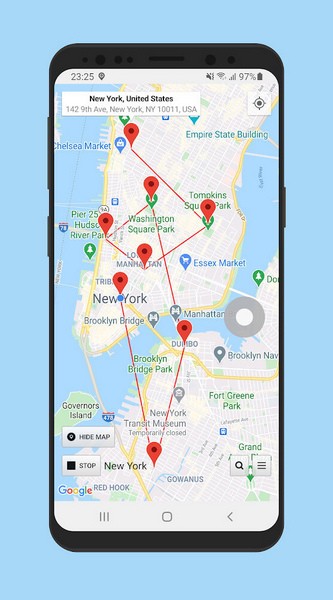 您可以在地图上添加多个图钉(添加更多),并以秒为单位设置间隔以更改每个图钉的位置。请注意,在 Android 中,当您关闭屏幕/设备进入睡眠模式时,时间间隔会有很大差异。要清除图钉,请点击完成,然后在地图上长按或搜索位置以设置新的单个图钉。您还可以从位置状态屏幕更改引脚(点击显示多个位置的位置)。