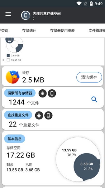 可显示您设备的 SDcard、USB 设备、内置以及外置存储设备信息,并以简单以及清晰的图表形式展示(信息图表)。