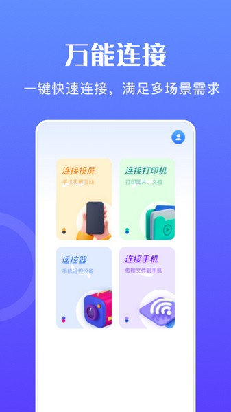为用户提供多种设备连接服务,通过手机WiFi万能连接投屏设备、打印机、手机、等,轻松使用投屏、打印、遥控等服务。