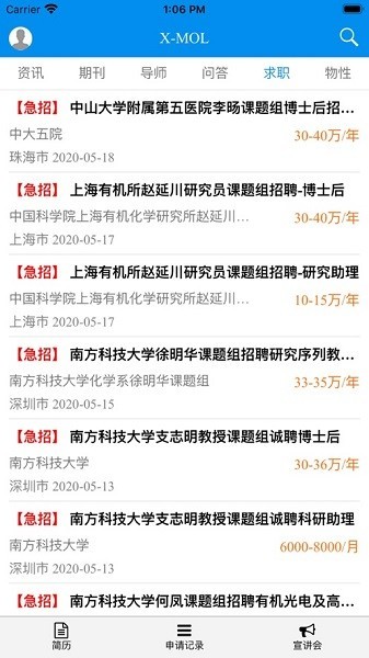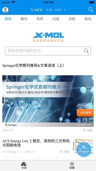 这个软件的功能挺多的。首先是学术期刊部分,里面有Nature、Science这些顶级期刊的最新论文信息,每天还会更新,非常方便查阅。其次是有行业资讯,会同步他们旗下的微信公众号“X-MOL资讯”,跟踪全球化学和生物医药领域的重要科研进展和新闻事件,还有中文摘要和深度分析,工作日都会更新。