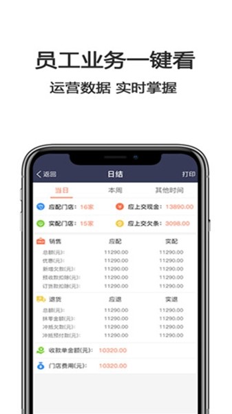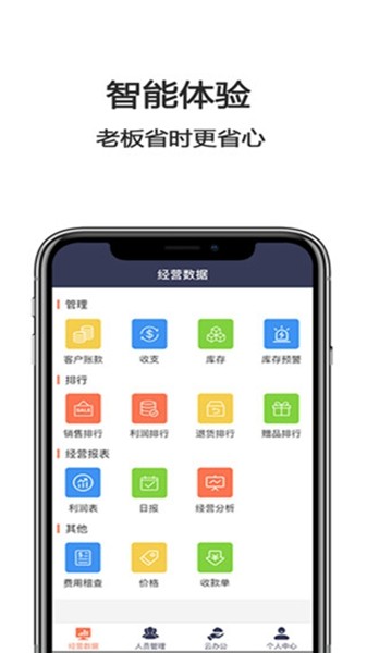 -数据管理(按人员、按商品、按门店查看利润贡献率、销售排行、退货排行;查看各业务人员的销售、退货、费用、收款等数据汇总;查看各仓库库存、价格、库存预警;查看各类经营报表、经营日报、利润表、同比及环比分析等)