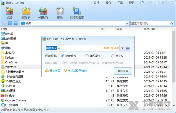 360压缩是一款免费、简单实用的压缩软件,支持解压rar、zip、iso等多种压缩文件。软件内采用全新的安全引擎,可以查杀病毒木马,打开压缩包自动扫描木马,安全性更高了,让用户解压压缩更加放心。不仅如此软件解压压缩速度也是非常快的,给用户带来便捷简单的使用体验。软件主要的特点就是内存小,兼容性好,安全,简约永久免费。如果你还在纠结于选择什么压缩软件的话,这款软件是你最好的选择。
