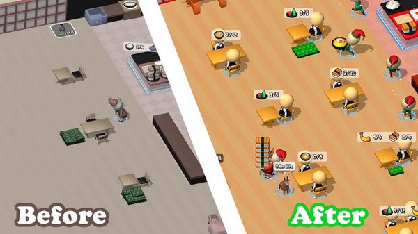 2.大量的设施类型,每种都有着不一样的用途,自由地进行放置和升级,打造独一无二的主题餐厅。