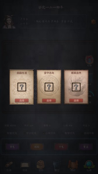 3、开启你的科举人生,完成各种随机事件,获取各种各样的装备和道具,不断进行合成,提升中举的概率。