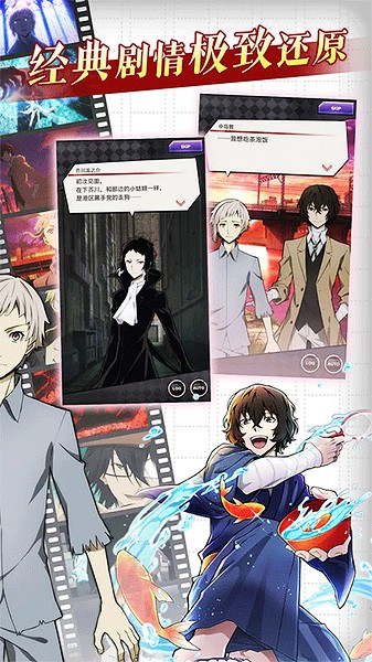 怀有文豪之名的游戏角色集结,无论是号称横滨F4的中岛敦、太宰治、芥川龙之介、中原中也,还是两大组织的头目福泽谕吉、森鸥外,还有泉镜花、江户川乱步、织田作之助、坂口安吾、费奥多尔等各种人气角色,你都有可能召集他们,成为队伍中的一员。