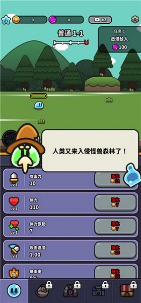 1、下载并打开游戏,来到游戏首界面后,可以看到下方的史莱姆属性等级升级条