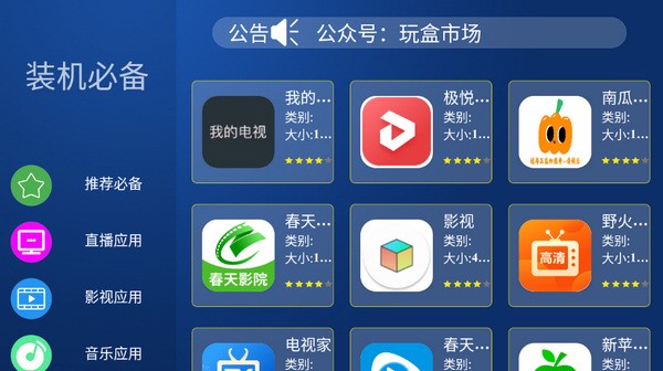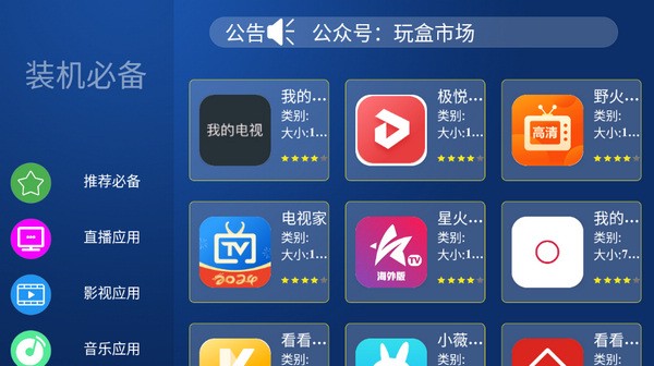 作为一名电视软件的新用户,我对玩盒市场TV版的表现感到满意。它的功能全面且易于使用,资源更新及时,而且内容丰富多样。通过这个平台,我可以轻松地观看各种节目,享受娱乐和学习的乐趣。对于喜欢大屏体验的用户来说,这款软件绝对是一个不错的选择。