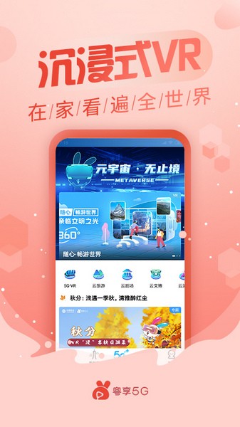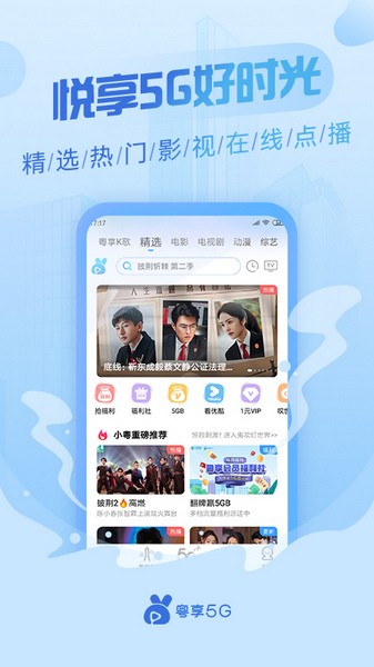 粤享5GAPP是一款由广东移动公司推出的手机高清影视播放器软件。这款软件内拥有诸多高清影视剧资源,娱乐综艺、体育新闻、院线大片、卡通动漫等等应有尽有,并且全部都是高清无码的完整资源,不缺失任何一部分,并且用户可以自行选择不同的播放方式,为用户打造影院般的观看体验。用户可以通过5G技术的应用来感受完全不一样的线上观看体验,更加高清更加流畅的多角度观影,对氛围的塑造更加真实,让用户更易沉浸在影片的氛围中。同时,用户还可以连接VR设备来在线播放VR影片,还有最新应用的AR技术,尝鲜最新的视觉技术。此外,这款软件内还开通了中国移动相关业务的办理渠道,用户可以在这里领取超多的手机流量,爽看视频,还可以办理5G靓号,参与各种新推出的5G营销活动,多重好礼拿到手软,并且所有的流程都经过了简化,轻轻松松就能搞定。