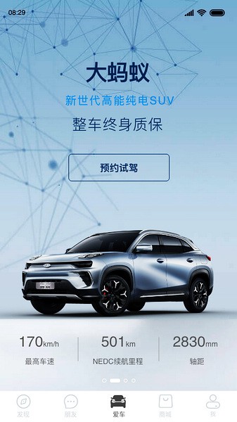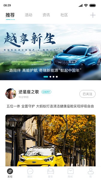 1、首先下载打开奇瑞新能源软件,在发现板块有在线资讯、交流社区、福利活动等功能,在这里可以学习用车知识和其他用户交流。