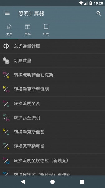照明计算器破解专业版是一款能够为用户们提供照明领域的计算服务的软件,囊括了单位转换以及计算、相关公式查询等在内的多项功能,大家也可以快速了解到相关的照明要求,以及不同规格灯泡的参数等等。软件使用简单又方便,操作也非常的简单,清爽简洁的界面更是大大降低了用户们的使用难度,因此也相当容易上手,绝对可以轻松满足大家在照明方面的计算需求。